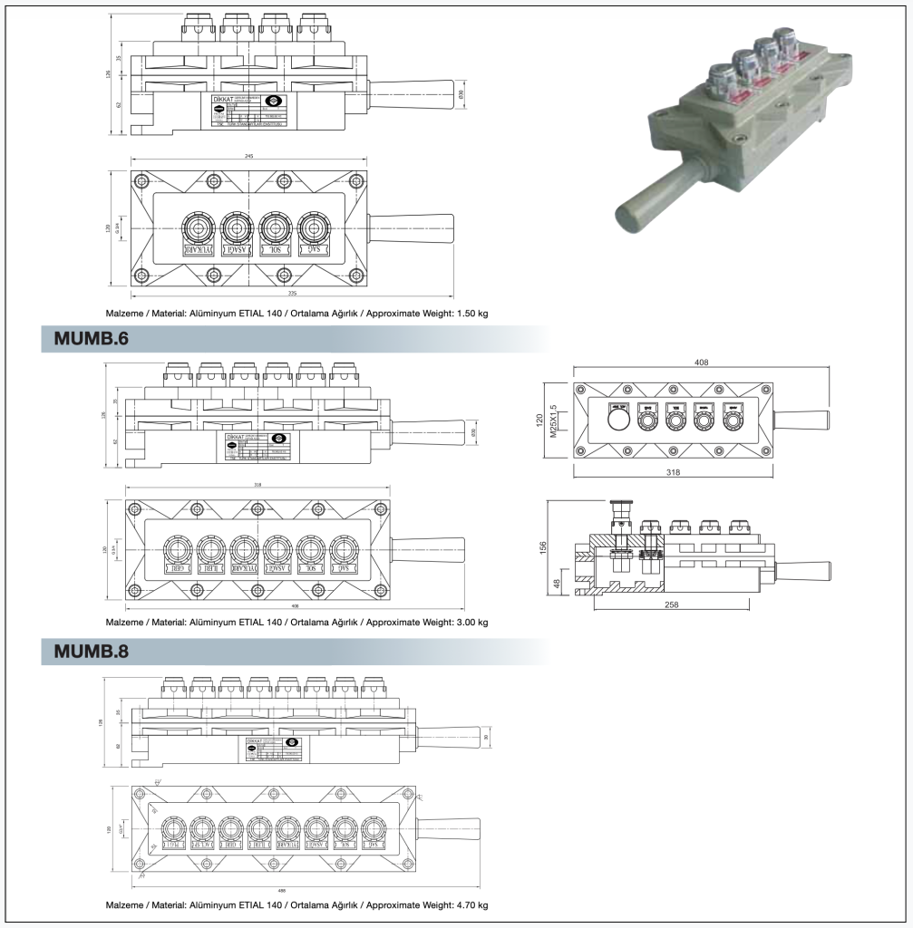 Zone 1, Zone 2, Zone 21 ve Zone 22 gibi yüksek riskli patlayıcı atmosferlerde kullanılabilen kumanda kutuları, aşırı titreşim, darbe ve ağır çalışma koşullarına uygun olacak şekilde Alüminyum ETIAL 140 malzemeden üretilir.